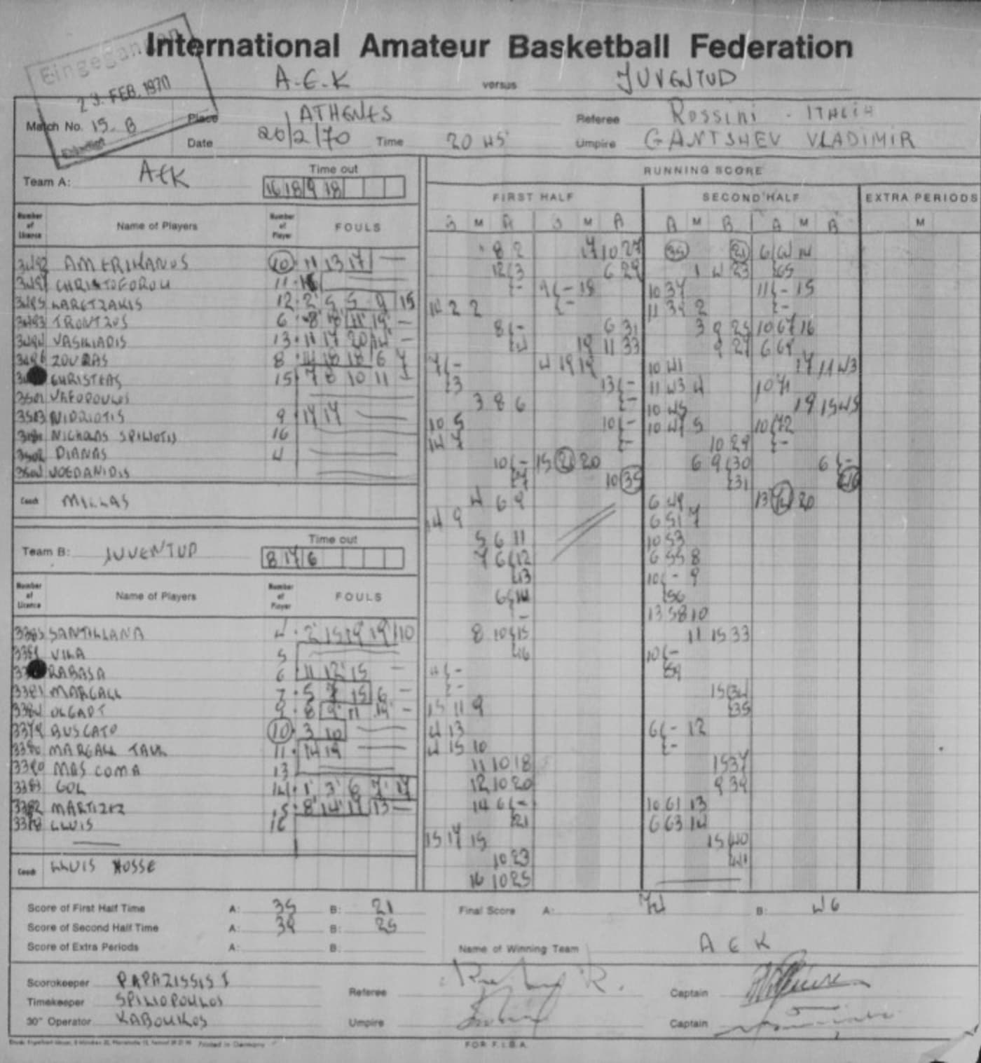 Η σύνθεση της Α.Ε.Κ. : Αμερικάνος 41, Τρόντζος 14, Ζούπας 10, Βασιλειάδης 12, Λαρεντζάκης 7, Τσάβας 1. Δειτε πλάνα της αναμέτρησης από το Εθνικό Οπτικοακουστικό Αρχείο.